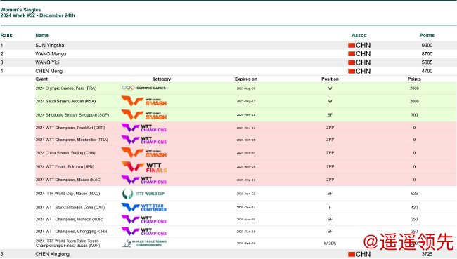 在国际乒联本周公布的最新一期世界排名中,陈梦女单排名第四,与樊振东一样,8个有效积分中有5个被赋0。