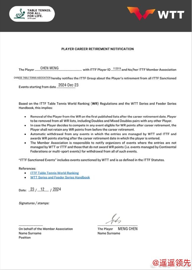北京时间12月27日下午,继上午樊振东微博宣布退出世界排名之后,巴黎奥运会乒乓球女单冠军得主陈梦同样发微博,宣布退出世界排名,并晒出了向国际乒联提交的申请照片。