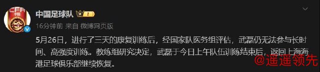5月26日,进行了三天的康复训练后,PG电子APP经国家队医务组评估,武磊仍无法参与长时间、高强度训练。教练组研究决定,武磊于今日上午队伍训练结束后,返回上海海港足球俱乐部继续恢复。