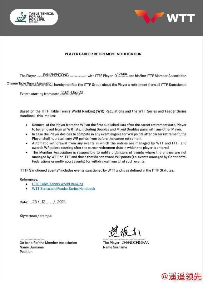 北京时间12月27日上午,乒乓球大满贯选手樊振东发微博,宣布退出世界排名。