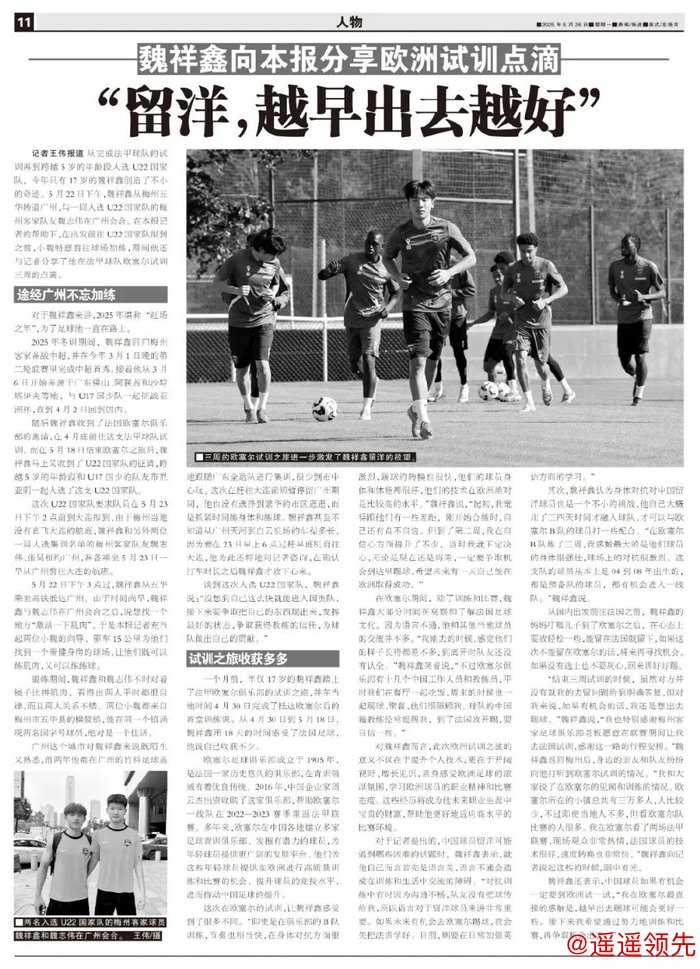 魏祥鑫还表示,中国球员如果有机会一定要到欧洲试一试,“我在欧塞尔最直接的感触是,越早出去踢球可能会更好一些。接下来我希望通过努力地训练和比赛,再争取机会出去。”